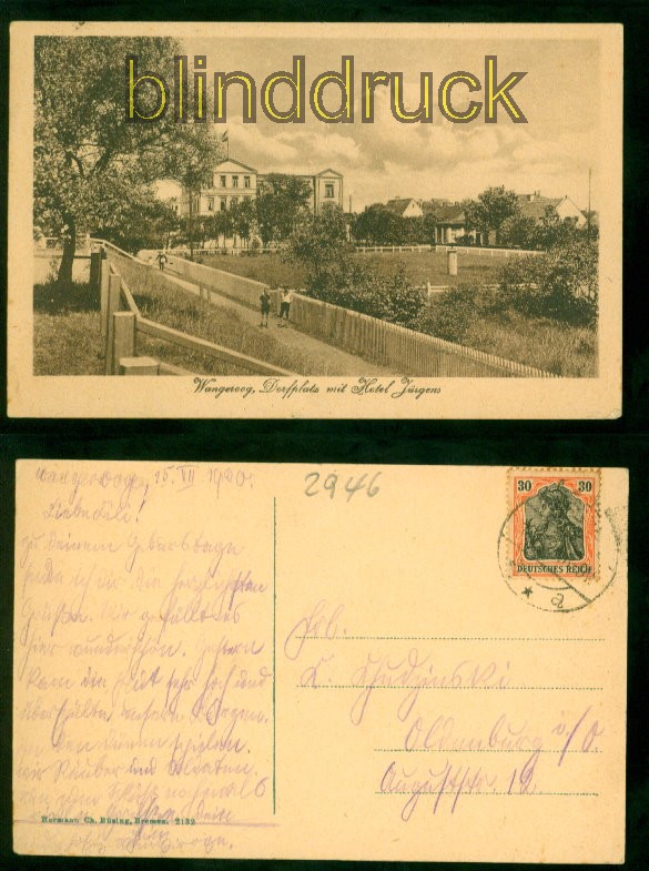 Niedersachsen Wangeroog sw-AK Dorfplatz und Hotel Jürgens 1920 nach Oldenburg Karte gelaufen aus Wangeroog 16.7.1920 nach Oldenburg Erhaltung siehe Scan