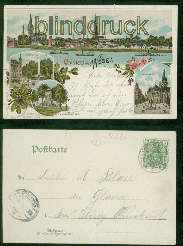 Nordrhein-Westfalen Gruss aus Wesel Litho-AK vier Ansichten 1904 nach Glane bei Iburg vier Ansichten: Gesamtansicht, Kaiserplatz mit Kaiserhof, Denkmal der 11 Schill´schen Offiziere und Grosser Markt Karte gelaufen aus Wesel 23.9.1904 nach Glane bei Iburg Ankunftsstempel kleiner Einriß Mitte oben Erhaltung siehe Scan