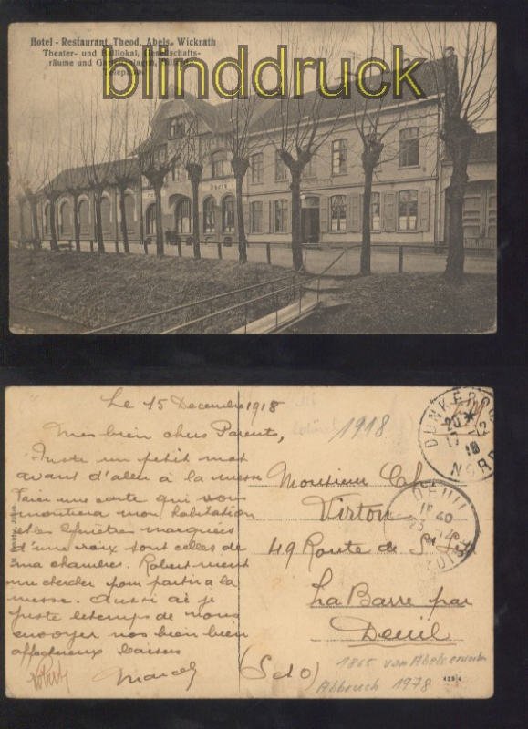 Nordrhein-Westfalen Wickrath sw-AK Hotel- Restaurant Theodor Abels 1918 Theater- und Balllokal, Gesellschaftsräume und Gartenanlagen, Billard, Telephon handschriftlicher vermerk: 1865 von Abels erworben, Abbruch 1978 Karte gelaufen 1919 nach Belgien Erhaltung siehe Scan