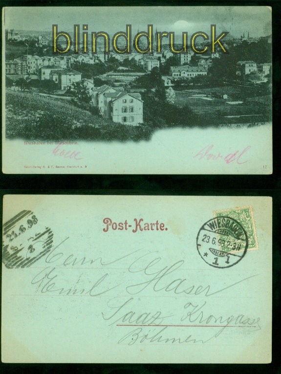 Hessen Wiesbaden Mondschein-AK Wiesbaden bei Mondschein 1898 nach Saaz Karte gelaufen aus Wiesbaden 23.6.1898 nach Saaz in Böhmen Ankunftsstempel Erhaltung siehe Scan