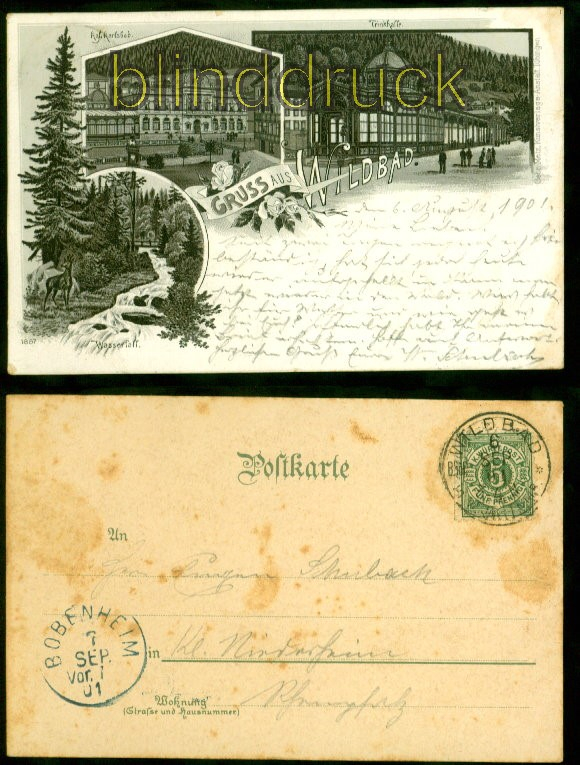 Baden-Württemberg Gruss aus Wildbad Litho-AK drei Ansichten 1901 nach Bobenheim drei Ansichten: Kgl. Karlsbad, Trinkhalle und Wasserfall Karte gelaufen aus Wildbad 6.9.1901 nach Bobenheim Karte rückseitig fleckig Erhaltung siehe Scan