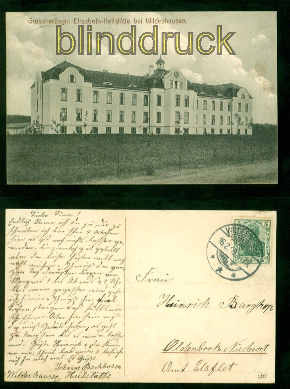 Niedersachsen Wildeshausen sw-AK Grossherzogin Elisabeth-Heilstätte 1909 nach Oldenbrok bei Elsfleth Karte gelaufen aus Wildeshausen 16.2.1909 nach Oldenbrok bei Elsfleth Erhaltung siehe Scan