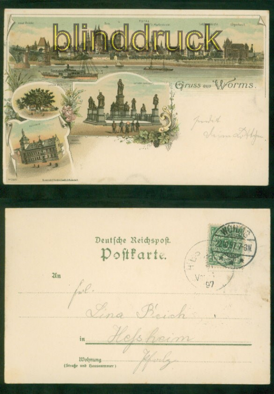 Rheinland-Pfalz Gruss aus Worms Litho AK vier Ansichten 1897 nach Hessheim vier Ansichten: Totalansicht, Luther-Baum, Lutherdenkmal und Rathaus Karte gelaufen aus Worms 22.10.1897 nach Hessheim Ankunftsstempel Erhaltung siehe Scan