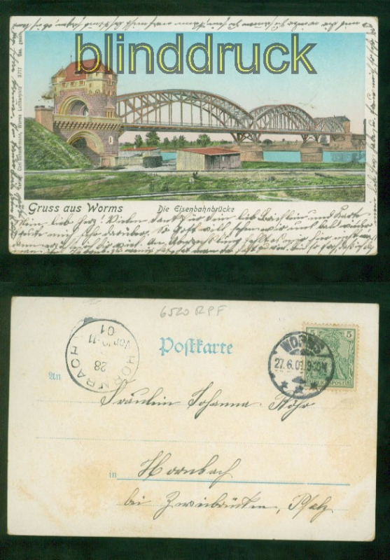 Rheinland-Pfalz Gruss aus Worms a. Rh. farb-AK die Eisenbahnbrücke 1901 nach Hornbach Karte gelaufen aus Worms 27.06.1901 nach Hornbach Ankunftsstempel Erhaltung siehe Scan