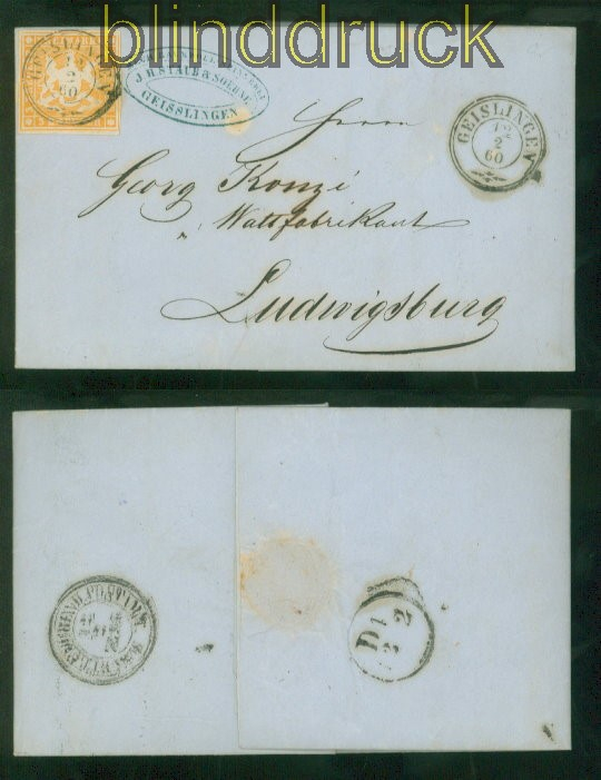 Württemberg Württemberg Mi # 12 EF Geislingen 12.2.1860 nach Ludwigsburg 3 Kreuzer gelb geschnitten ohne Seidenfaden als Einzelfrankatur EF auf Fernbrief aus Geislingen 12.2.1860 nach Ludwigsburg Rückseitig Bahnpoststempel Erhaltung siehe Scan
