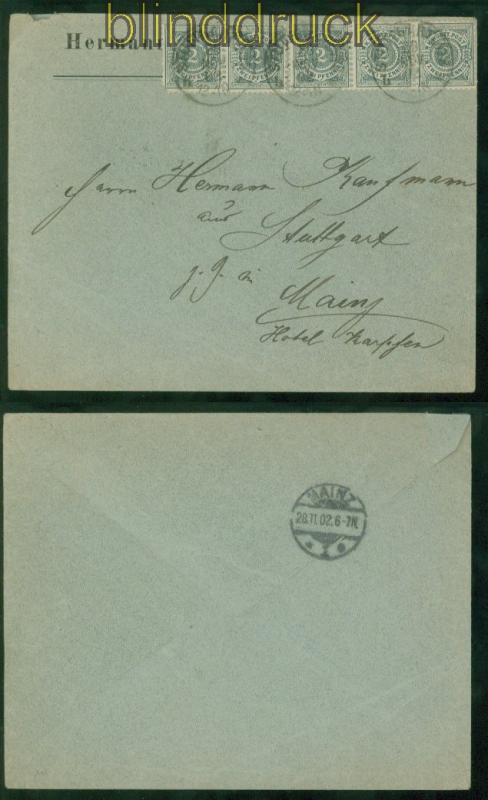 Württemberg Mi # 60 (5) MeF Fernbrief aus Stuttgart 1902 nach Mainz 2 Pfennig dunkelgrautürkis ein waagerechtes Paar und ein waagerechter 3er-Streifen als Mehrfachfrankatur MeF portogerecht auf Fernbrief aus Stuttgart 23.11.1902 nach Mainz Ankunftsstempel eine Marke eckrund Erhaltung siehe Scan