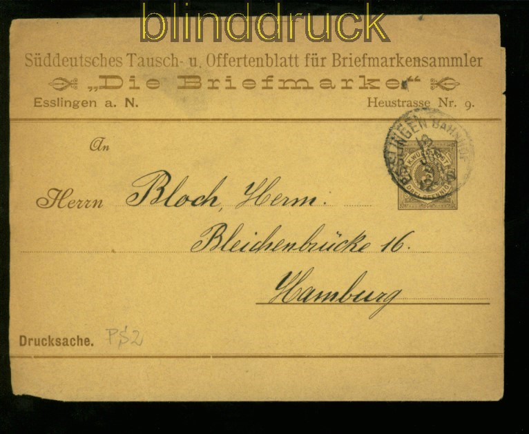 Altdeutschland Württemberg Privat-Streifband # PS 2 B1/01 Die Briefmarke Esslingen 1894 gelblich Privat-Streifband Süddeutsches Tausch- u. Offertenblatt für Briefmarkensammler Die Briefmarke Esslingen a. N. gelbliches Papier gelaufen Esslingen 12.6.1894 nach Hamburg Erhaltung siehe Scan