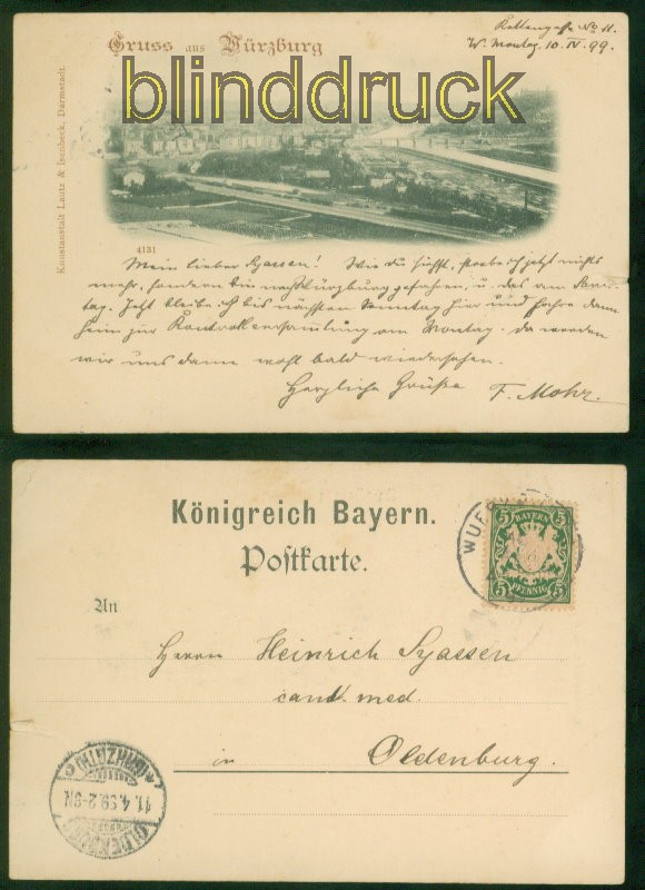 Bayern Gruss aus Würzburg Litho-AK Gesamtansicht 1899 nach Oldenburg Karte gelaufen aus Würzburg 10.4.1899 nach Oldenburg Karte Mitte rechts kleiner Einriß Erhaltung siehe Scan