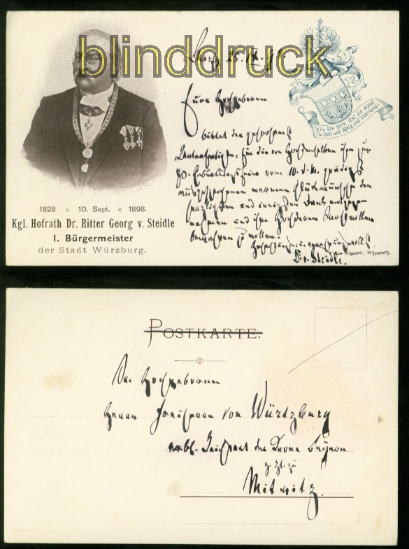 Bayern Würzburg sw-AK Kgl. Hofrath Dr. Ritter Georg von Steidle 1898 I. Bürgermeister der Stadt Würzburg Karte nicht gelaufen, aber adressiert an Freifrau von Würtzburg zurzeit in Mitwitz Danksagung für die Glückwünsche zum 70 Geburtstag vom Kgl. Hofrath Dr. Ritter Georg von Steidle mit Originalunterschrift Erhaltung siehe Scan