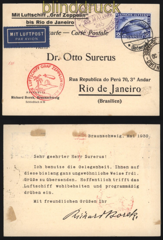 Deutsches Reich Zeppelin LZ 127 Südamerikafahrt 1930 Graf Zeppelin Mi # 438 EF Südamerikafahrt 1930 Graf Zeppelin mit Bestätigungsstempel in rot frankiert mit Mi # 438 X 2 RM Südamerikafahrt Aufgabe Friedrichshafen 18.5.1930 nach Rio de Janeiro Mi # 62 mit allen Stempeln Erhaltung siehe Scan