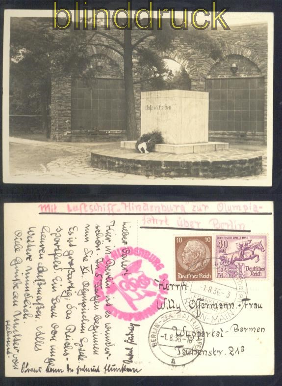 Deutsches Reich Zeppelin Olympiafahrt Sieger # 427 B Mi # 616 und 518 LZ 129 Hindenburg frankiert mit 40 Pfg. Olympiamarke sowie 10 Pfg. Hindenburg Auflieferung Frankfurt/Main mit Sonderbestätigungsstempel gelaufen nach Wuppertal-Barmen Erhaltung siehe Scan