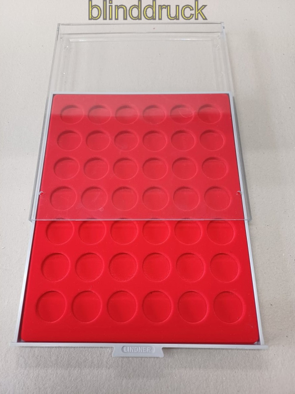 Lindner Münzbox 2107 Standard mit roter Einlage gebraucht Münzbox mit 42 runden Fächern mit 27,50 mm passend für Deutsche 5 Euro leer gebraucht Erhaltung siehe Scan