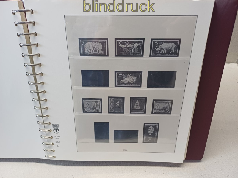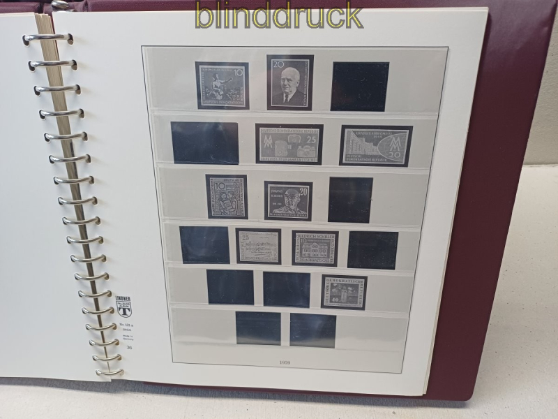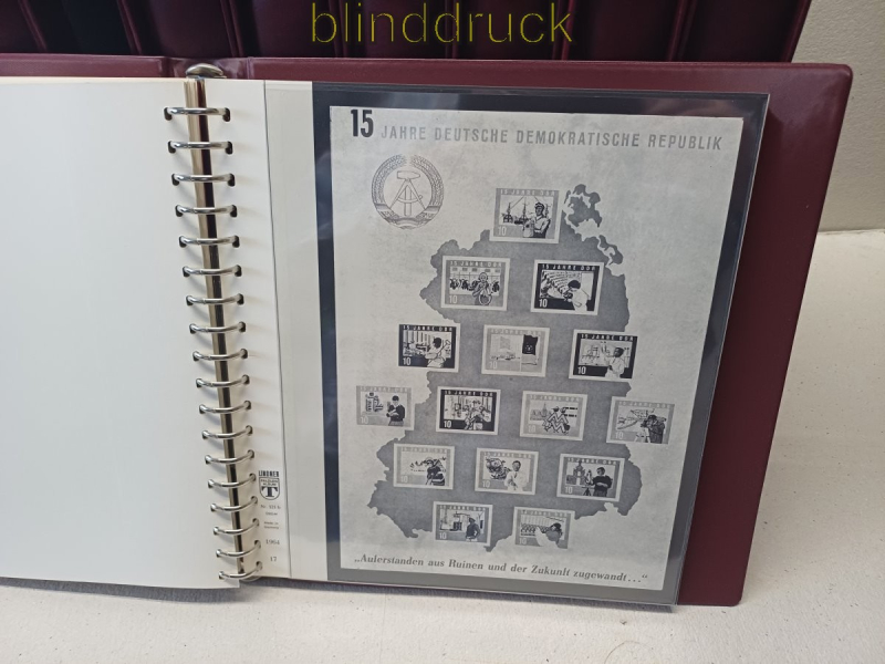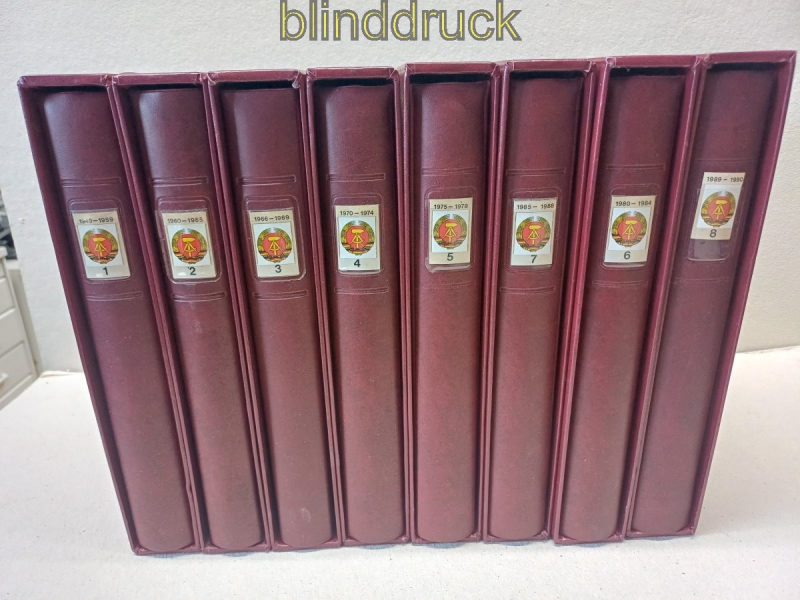 Lindner-T DDR Vordruck 1949 bis 1990 in 8 roten Ringbindern mit Kassette 1122-w Deutsche Demokratische Republik DDR Vordruckblätter in Lindner-T Ausführung Nr. 121 a in acht roten Ringbindern mit Kasstten ohne Griffmulden Atrikelnummer 1122-w enthalten sind folgende Jahrgänge: 1949 bis 1990 Es sind keine Marken in den Alben von den 3365 abgebildeten Marken oder sind 229 (6,8 %) der Bildnisse durch eine schwarze Hawid-Klemmrtasche verdeckt der Sammler hat die postfrischen Marken in den Folien und die gestempelten Marken in den schwarzen Hawid-Klemmtaschen gesammelt gebraucht Neupreis über 1.300,00 Euro Erhaltung siehe Scan