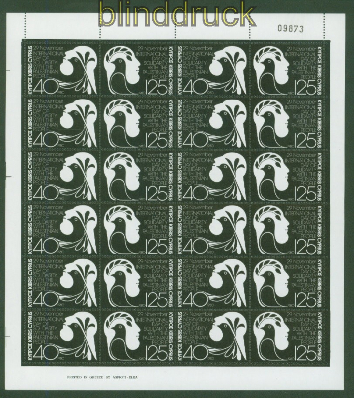 Zypern Mi # 542/43 postfrisch Solidarität mit Palästina kplt. Zdr.-Bogen Internationale Tag der Solidarität mit dem palästinensischen Volk komplette Ausgabe im Zusammendruckbogen postfrisch Erhaltung siehe Scan