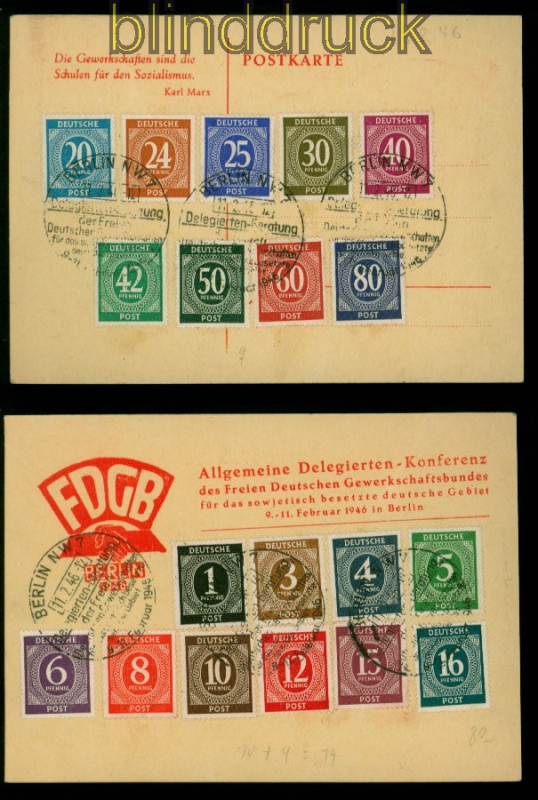 Alliierte Besetzung 19 Ausgaben 1. Kontrollrat mit Mi # 930 auf FDGB-Karte SSt. Berlin 19 verschiedene Ausgaben der ersten Kontrollratsausgabe 1 bis 80 Pfg. einschließlich der Mi # 930 42 Pfg. Ziffer vorder- und rückseitig verklebt auf FDGB-Karte entwertet mit Sonderstempel SSt. 11.2.1946 Delegiertenberatung Karte nicht gelaufen Erhaltung siehe Scan