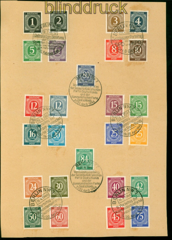 Alliierte Besetzung Gemeinschaftsausgaben Mi # 911/936 mit # 930 SSt. Berlin Vorlageblatt 1 Pfennig bis 84 Pfennig der I. Kontrollratsausgabe auf Vorlageblatt mit fünf verschiedenen Sonderstempel SSt. Berlin Delegierten-Beratung der Freien Deutschen Gewerkschaften Berlin Parteitag der Sozialdemokratischen Partei Berlin 15. Parteitag der Kommunistischen Partei Deutschlands Berlin Gemeinsamer Parteitag der SPD und KPD Berlin Vereinigungsparteitag der SPD und der KPD mit 42 Pfennig schönes zeitpolitisches Dokument Erhaltung siehe Scan