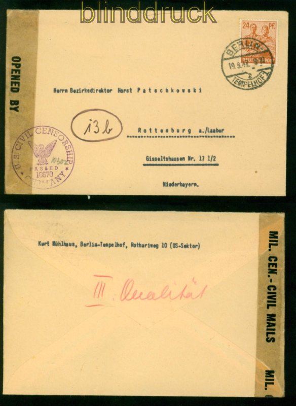 Alliierte Besetzung Gemeinschaftsausgaben Mi # 951 EF auf Zensurbrief Berlin 1947 nach Rottenburg 24 Pfennig I. Kontrollratsausgabe portogerechte Einzelfrankatur EF auf Zensurbrief aus Berlin 19.9.1947 nach Rottenburg in Bayern Erhaltung siehe Scan
