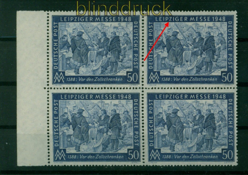 Alliierte Besetzung Gemeinschaftsausgaben Mi # 967 II postfrisch im 4er-Block Plattenfehler 50 Pfg. Leipziger Herbstmesse 1947 mit Plattenfehler II: Farbstrich unten durch Z postfrisch Erhaltung siehe Scan