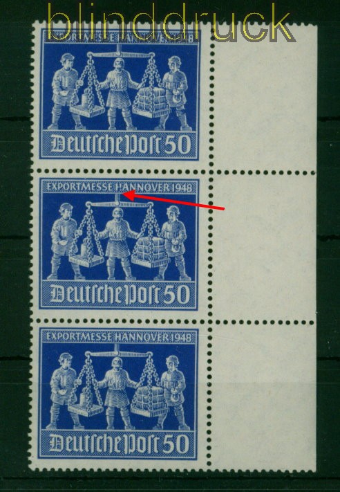Alliierte Besetzung Gemeinschaftsausgaben Mi # 970 IV postfrisch im senkrechten 3er-Streifen Plattenfehler 50 Pfg. Exportmesse Hannover 1948 mit Plattenfehler IV: H von Hannover unten beschädigt postfrisch Erhaltung siehe Scan