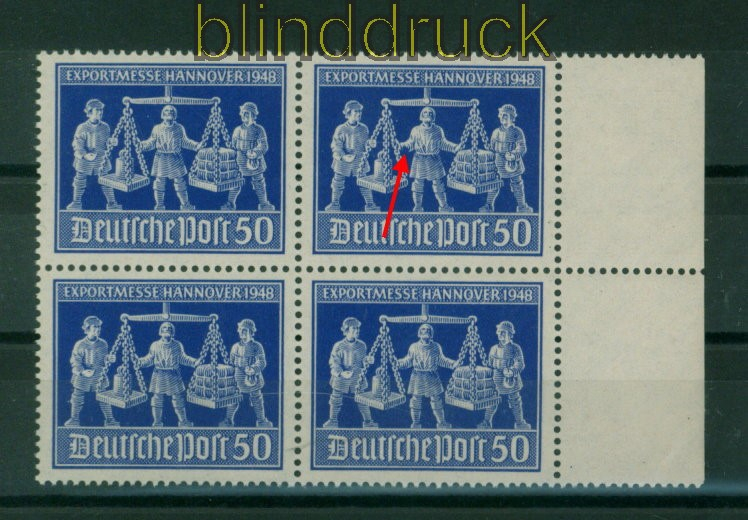 Alliierte Besetzung Gemeinschaftsausgaben Mi # 970 VIII postfrisch im 4er-Block Plattenfehler 50 Pfg. Exportmesse Hannover 1948 mit Plattenfehler VIII: Farbfleck am linken Unterarm postfrisch Erhaltung siehe Scan