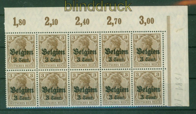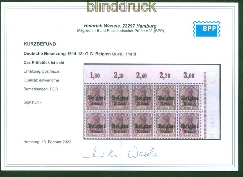 Deutsche Besetzung 1. Weltkrieg Landespost in Belgien Mi # 11 a III postfrisch 10er-Bogenteil OR Platte Kurzbefund Wasels BPP 3 C auf 3 Pfg. Germania im 9er-Bogenteil Marke Type III mit 5 Marken vom Oberrand im Plattendruck postfrisch für das Bogenteil Kurzbefund Wasels BPP Erhaltung siehe Scan