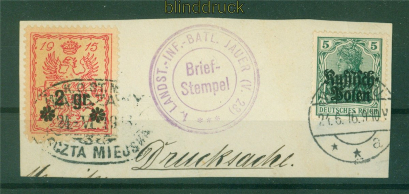 Deutsches Reich Deutsche Besetzung 1. Weltkrieg Deutsche Post in Polen Mi # 2 MiF mit Stadtpost Warschau # 9 2 Pfennig Germania auf Briefstück mit Stadtpost Warschau # 9 Briefstempel 1. Landst.-Inf.-Batl. Jauer (V. 23) durch die Mi # 2 geht ein senkrechter Bug Erhaltung siehe Scan