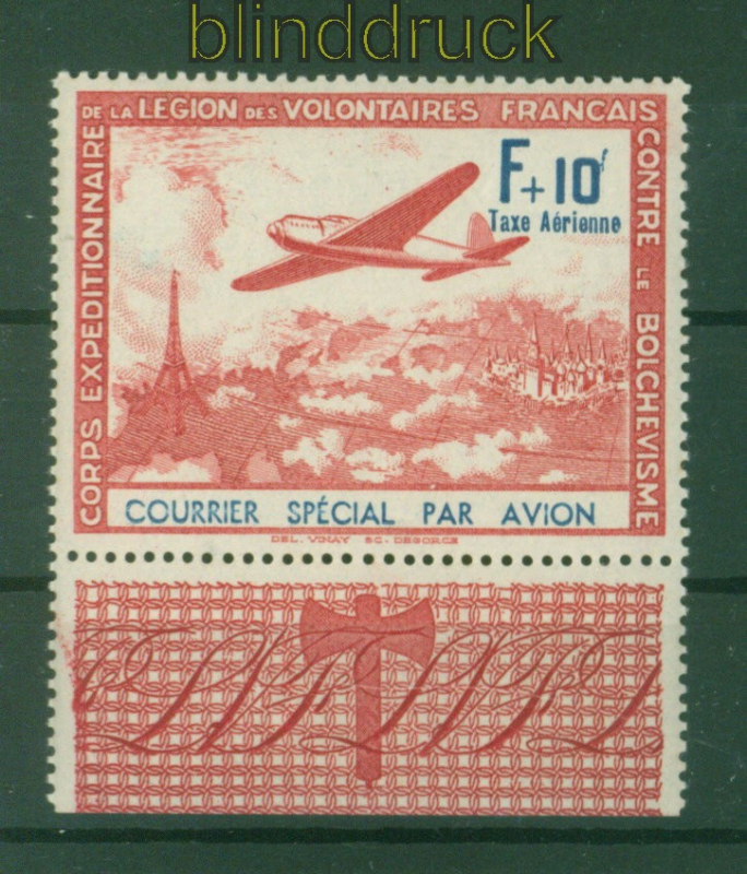 Deutsche Besetzung 2. Weltkrieg private Ausgaben Frankreich Mi # III postfrisch F + 10 F Flugpostvignette postfrisch rückseitig mit Abklatsch Erhaltung siehe Scan