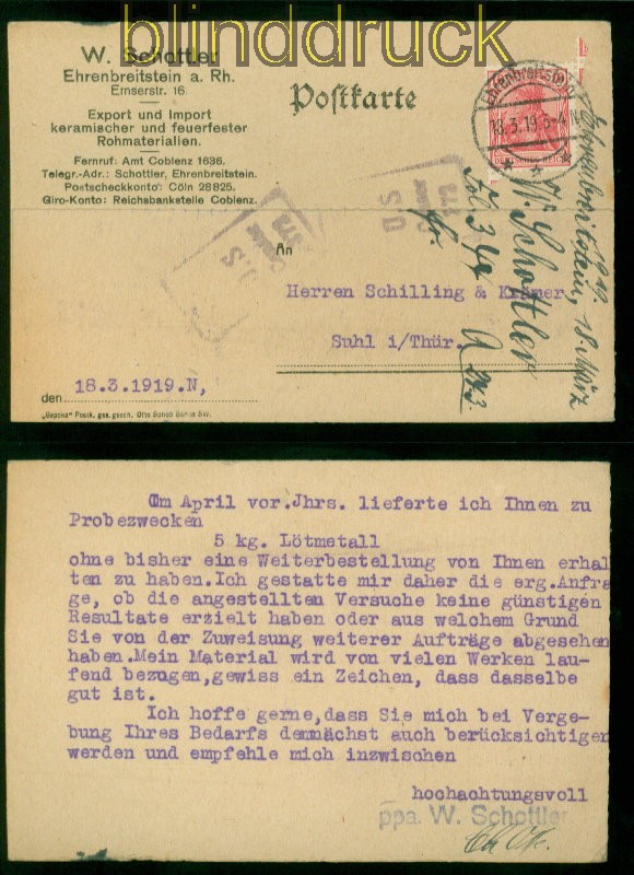Deutsches Reich 10 Pfg. Germania Postkarte mit US-Zensur Ehrenbreitstein 18.3.1919 10 Pfg. Germania auf Postkarte aus Ehrenbreitstein 18.3.1919 nach Suhl in Thüringen mit US-Zensur mit doppelt abgeschlagener Zensurstempel schwarzer R2: U.S. / No 372 Erhaltung siehe Scan