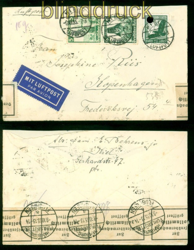 Deutsches Reich Auslands-Luftpost-Brief Devisenkontrolle Kiel 9.10.1935 nach Kopenhagen senkrechter Zusammendruck S 231 aus Nothilfe 1935 mit 50 Pfg. Steinadler Luftpostaufgabestempel Kiel # D 24-01 gelaufen aus Kiel Luftpost 9.10.1935 nach Kopenhagen in Dänemark Devisenkontrolle Hamburg-Fuhlsbüttel Flughafen 9.10.1935 Erhaltung siehe Scan