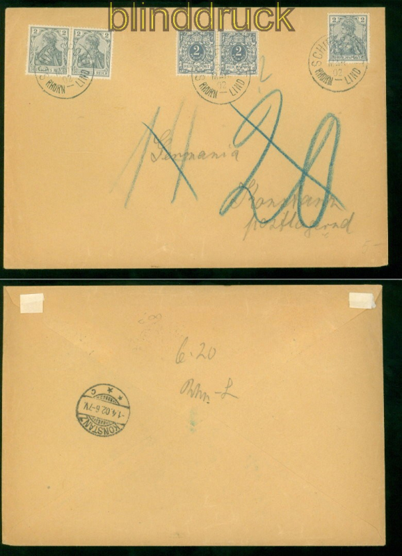 Deutsches Reich Bodensee Schiffspost MiF Krone/Adler mit Germnia Romanshorn-Lindau 1902 Bodensee Schiffspostbrief Romanshorn - Lindau 31.03.1902 nach Konstanz frankiert mit waagerechtem Paar Mi # 52 Krone/Adler 2 Pfennig sowie drei Marken 2 Pfennig Germania Reichspost dabei ein waagerechtes Paar zweimal mit Nachtaxe belegt und gestrichen interessanter Beleg Ankunftsstempel Erhaltung siehe Scan