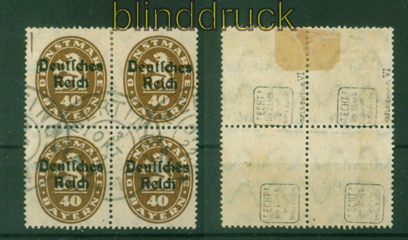 Deutsches Reich Dienstmarken Mi # 39 gestempelter 4er-Block mit 2 x PF VI geprüft Infla Berlin 40 Pfennig Dienstmarke Bayernabschiedausgabe die beiden oberen Marken mit Aufdruckabart VI: geschlossenes D gestempelt geprüft Infla Berlin Erhaltung siehe Scan