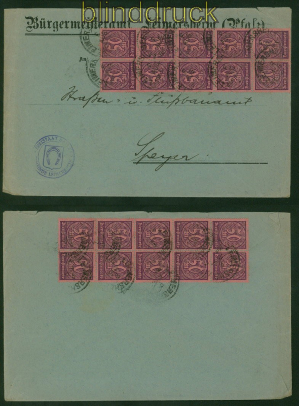 Deutsches Reich Dienst Mi # 73 (20) MeF Eimersheim 8.8.1923 nach Speyer 20 Marken 50 Mark schwärzlich violett auf mittelrötlichkarmin Mehrfachfrankatur auf Fernbrief gelaufen aus Eimersheim 8.8.1923 nach Speyer Erhaltung siehe Scan
