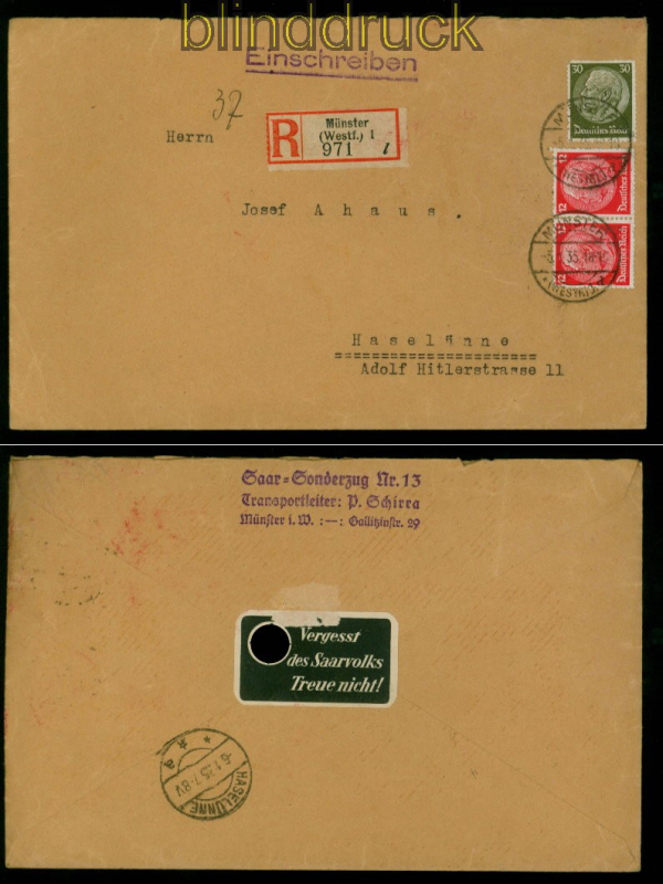 Deutsches Reich Einschreiben Saarabstimmung Saar-Sonderzug Nr. 13 Vergesst des Saarvolk Treue nicht Hindenburg Wasserzeichen 4 Mischfrankatur portogerecht aus Münster 5.1.1935 nach Haselünne rückseitig mit Vignette: Vergesst des Saarvolks Treue nicht Absender: Saar-Sonderzug Nr. 13 Transportleiter P. Schirra, Münster schönes Dokument zur Saarabstimmung Erhaltung siehe Scan