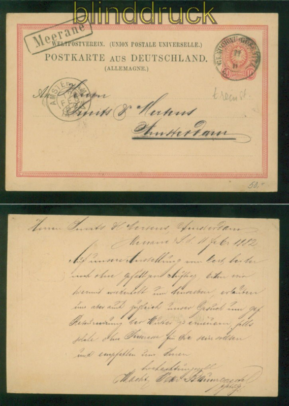 Deutsches Reich GSK 10 Pfennig Bahnpost Glauchau-Gösswitz Aufgabe Meerane 1882 (58947) Ganzsachenkarte 10 Pfennig Ziffer im Oval mit Bahnpost Glauchau-Gösswitz gelaufen Aufgabestempel Meerane 11.2.1882 nach Amsterdam Erhaltung siehe Scan