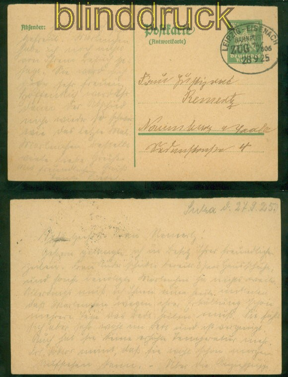 Deutsches Reich GSK 5 Pfennig mit Bahnpost Leipzig-Eisenach 1925 nach Naumburg Ganzsachenkarte 5 Pfennig grün gelaufen mit Bahnpost Leipzig - Eisenach Zug 74/806 28.9.1925 nach Naumburg/Saale Erhaltung siehe Scan