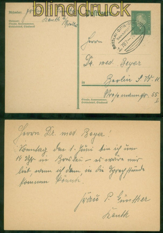 dt. Reich GSK 8 Pfennig Bahnpost Breslau-Dittb.-Görlitz 1930 nach Berlin (51296)