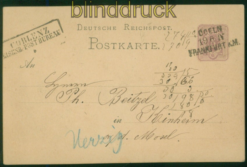Deutsches Reich GSK Bahnpost Coeln - Frankfurt Aufgabestempel Coblenz 1879 5 Pfennige Ganzsachenkarte gelaufen mit Bahnpost Coeln - Frankfurt 19 6 IV nach Kinheim / Mosel Aufgabestempel Coblent Eisenb. Post Bureau Erhaltung siehe Scan