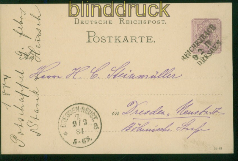 Deutsches Reich GSK Bahnpost Reichenbach - Dresden 1884 5 Pfg. Ganzsachenkarte gelaufen mit Bahnpost Reichenbach - Dresden 9.2.1884 nach Dresden Erhaltung siehe Scan