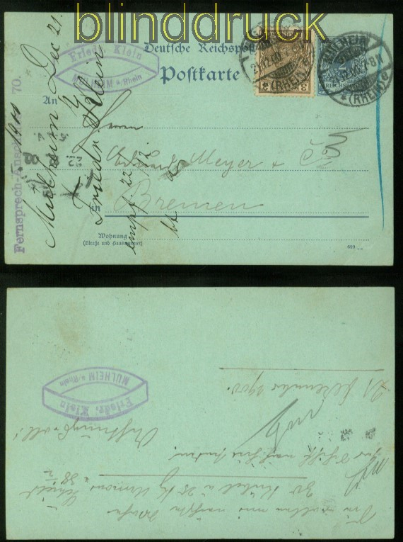 Deutsches Reich GSK Krone/Adler in MiF mit Germania Mülheim 1900 bessere Mischfrankatur Ganzsachenkarte GSK 2 Pfg. Krone/Adler mit 3 Pfg. Germania Reichspost Karte gelaufen aus Mülheim 21.12.1900 nach Bremen Erhaltung siehe Scan