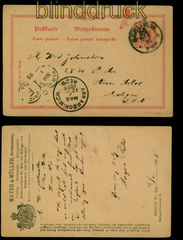 Deutsches Reich GSK P 25 mit privaten Zudruck Mayer & Müller in die USA 1895 10 Pfg. Krone/Adler Ganzsachenkarte P 25 mit seltenem privaten Zudruck der Firma Mayer & Müller seltene Karte Karte gelaufen aus Berlin 15.2.1895 in die USA Ankunftsstempel und Paid-All Stempel Erhaltung siehe Scan