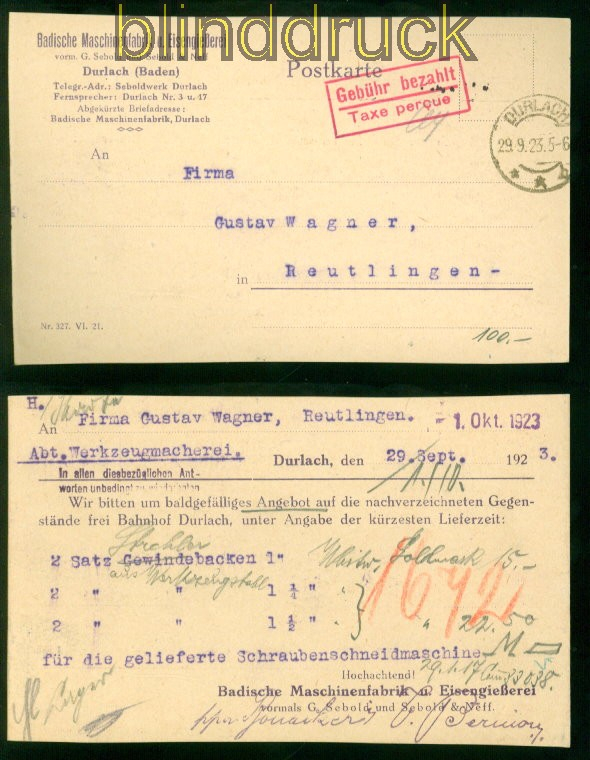 dt. Reich Gebühr bezahlt Durlach 29.9.1923 auf Postkarte nach Reutlingen (58211)