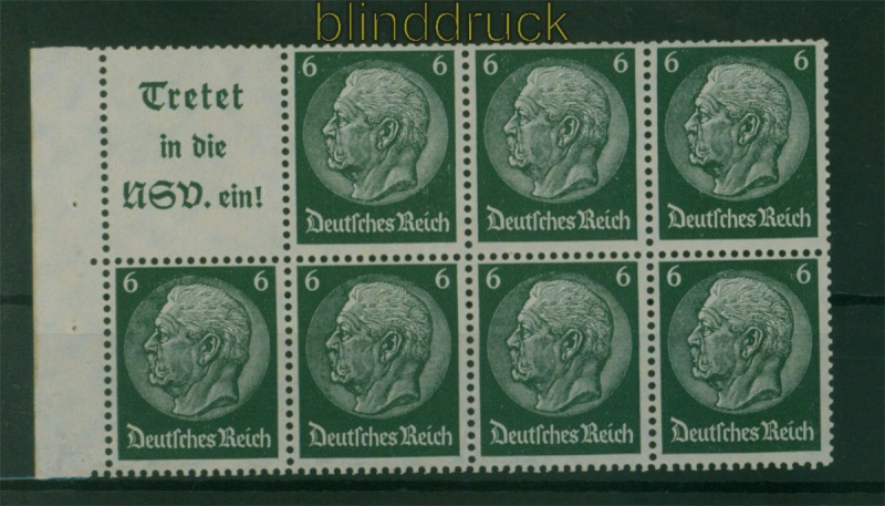 Deutsches Reich Heftchenblatt Mi # 96 B postfrisch Hindenburg Wasserzeichen 4 Hindenburg mit Wasserzeichen 4 komplettes Heftchenblatt mit Heftchenblattrand mit Reklamefeld: Tretet in die NSV ein postfrisch Erhaltung siehe Scan