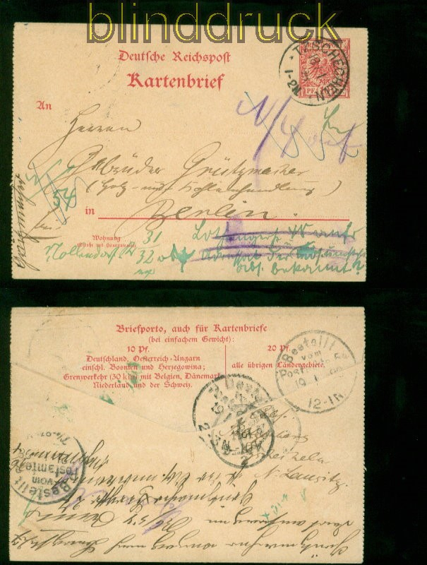 Deutsches Reich Kartenbrief Tzschechein 18.1.1898 nach Berlin diverse Vermerke und Stempel 10 Pfennig Kartenbrief Krone/Adler gelaufen aus Tzschechein 18.1.1898 nach Berlin diverse handschriftliche Vermerke vorder- und rückseitig sowie 5 Stempel Erhaltung siehe Scan