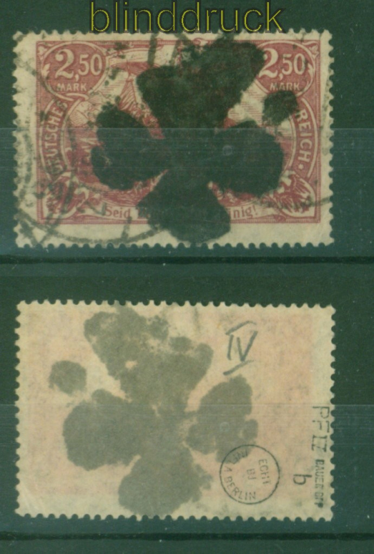 Deutsches Reich Mi # 115 b IV gestempelt Plattenfehler geprüft Bauer BPP 2,50 Mark Reichspostamt lebhaftrotkarmin mit Plattenfehler IV: Fahnenspitze gebrochen und weißer Fleck im linken Flügel des Genius gestempelt geprüft Bauer BPP Eckbug unten rechts seltener Plattenfehler im Katalog nicht bewertet Erhaltung siehe Scan