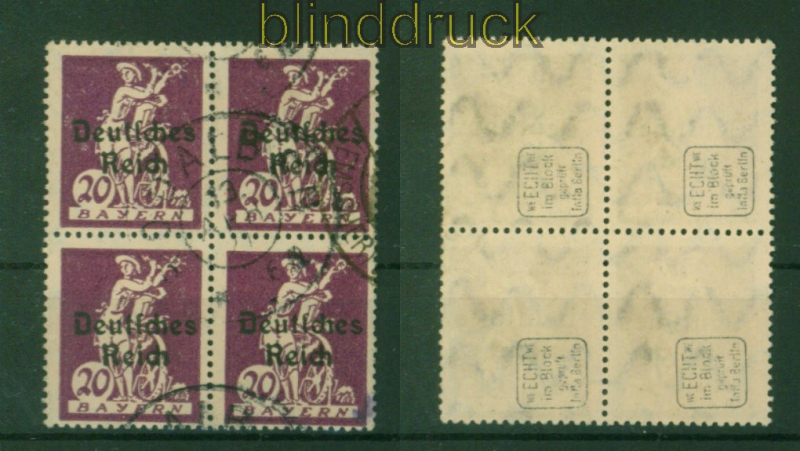 Deutsches Reich Mi # 122 gestempelter 4er-Block geprüft Infla Berlin 20 Pfg. Bayernabschied als 4er-Block gestempelt geprüft Infla Berlin Erhaltung siehe Scan