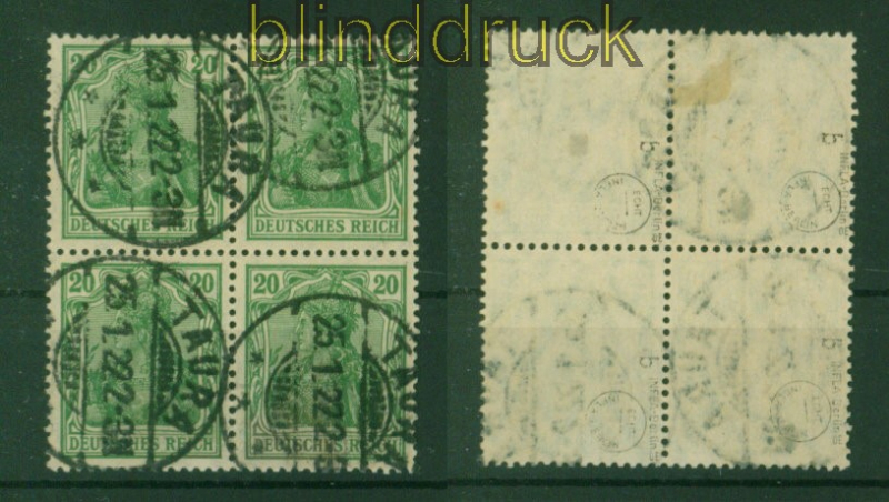 Deutsches Reich Mi # 143 b gestempelter 4er-Block geprüft Infla Berlin 20 Pfennig Germania dunkelgelblichgrün als 4er-Block gestempelt geprüft Infla Berlin Erhaltung siehe Scan