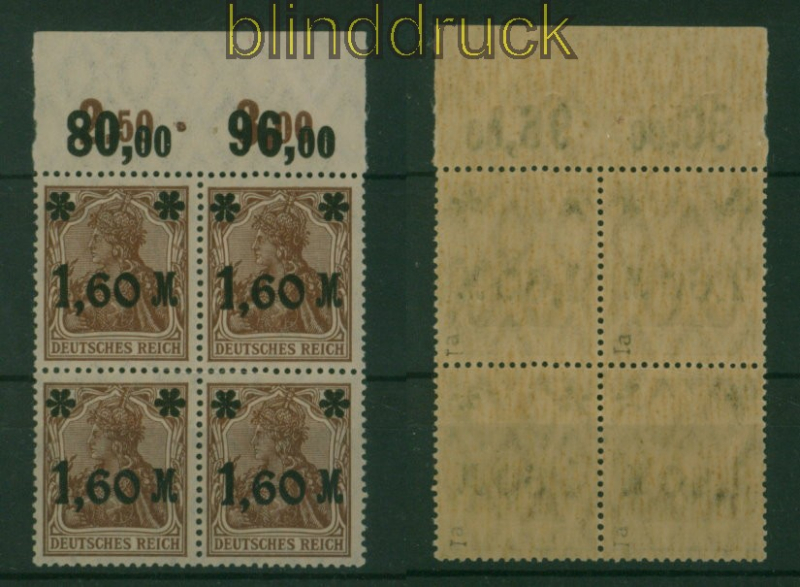 Deutsches Reich Mi # 154 I a OR P postfrisch 4er-Block geprüft Infla Berlin Aufdruckmarke 1,60 Mark auf 5 Pfg Germania braun 4er-Block vom Oberrand im Plattendruck postfrisch geprüft Infla Berlin Erhaltung siehe Scan