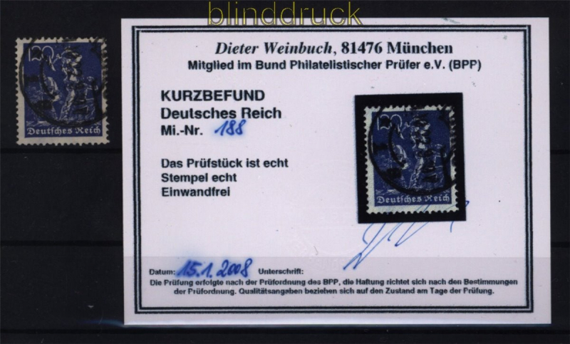 Deutsches Reich Mi # 188 gestempelt Kurzbefund Weinbuch BPP 120 Pfg. Bergarbeiter mit Wasserzeichen Waffeln gestempelt Kurzbefund Weinbuch BPP: echt und einwandfrei Erhaltung siehe Scan
