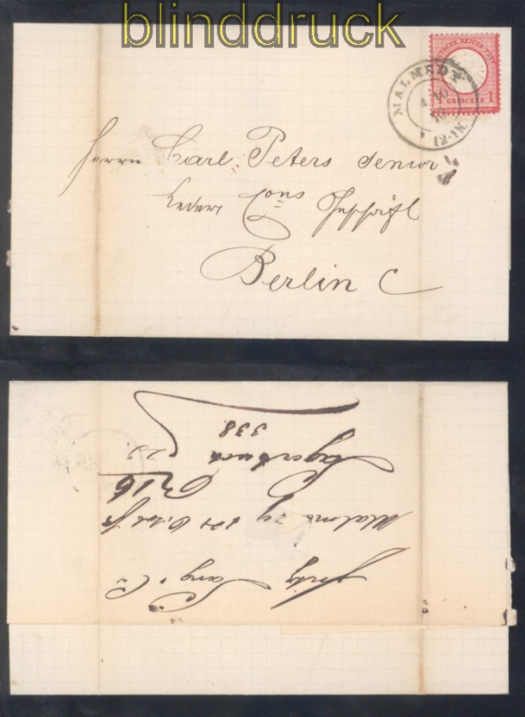 Deutsches Reich Mi # 19 EF Malmedy 4.10.1873 nach Berlin Feuser # 2071 1 Groschen großer Schild als Einzelfrankatur EF mit nachverwendeten Preussen Altdeutschlandstempel Malmedy 4.10.1873 nach Berlin Feuser # 2071 Erhaltung siehe Scan