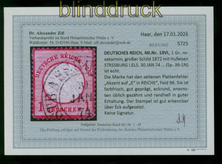 Deutsches Reich Mi # 19 VI Hufeisenstempel Plattenfehler Fotobefund Dr. Zill BPP 1 Groschen großer Schild gestempelt mit Hufeisenstempel Strassburg Spalink # 36-1N mit Plattenfehler VI: Akzent auf E von Reichs interessant Fotobefund Dr. Zill BPP: ".... ist echt, frabfrisch, gut geprägt, eckrund randhell in guter Erhaltung" Erhaltung siehe Scan